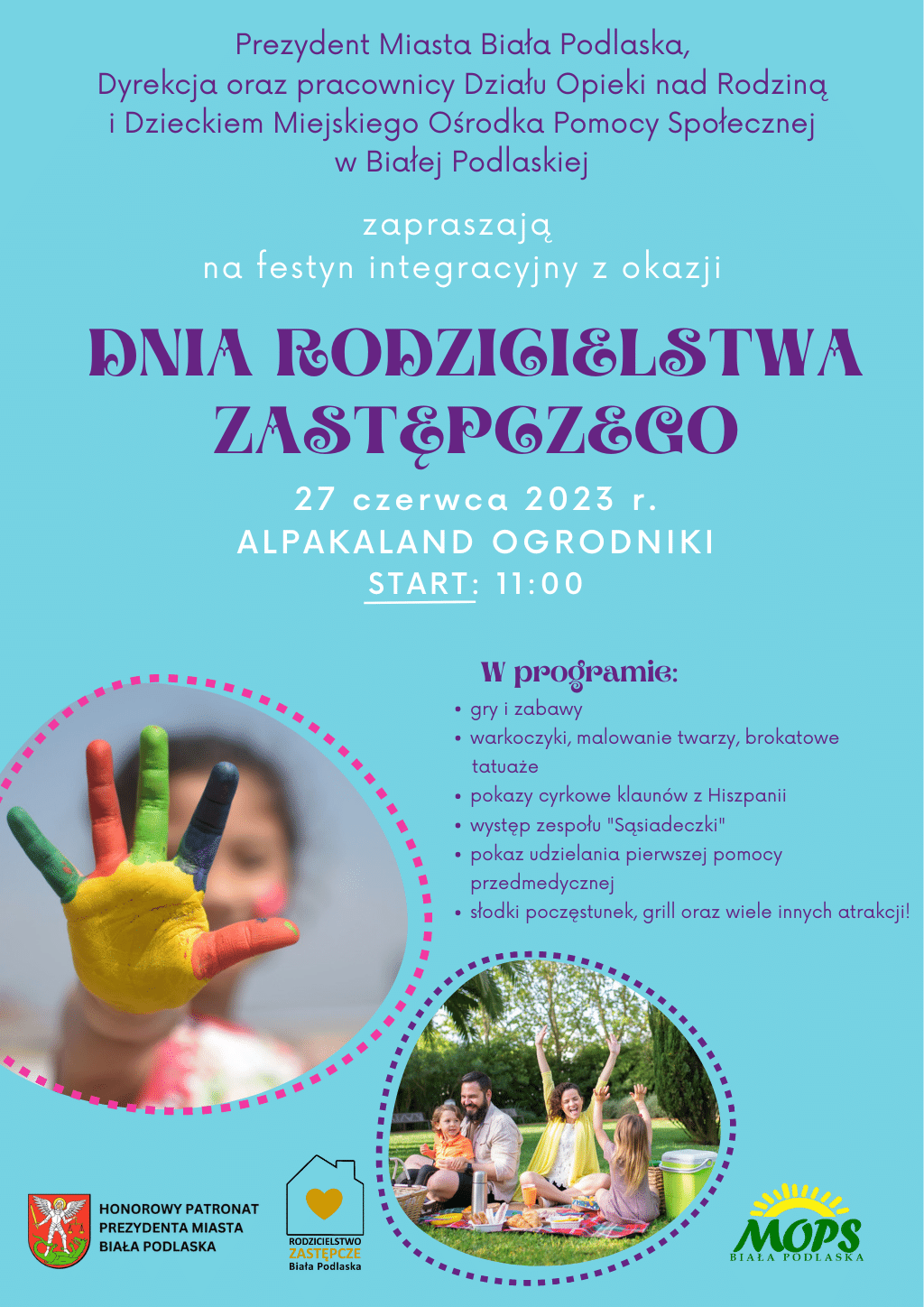 Świętując wspólnie z rodzinami zastępczymi Dzień Rodzicielstwa Zastępczego, chcemy podziękować im za ich trud i poświęcenie, pokazać szacunek do ich pracy, a także zwrócić uwagę na to, jak ważny dla społeczeństwa jest rozwój działalności wszelkich form rodzicielstwa zastępczego. Tegoroczne wydarzenie odbędzie się w dniu 27 czerwca 2023 r., w godz. 11:00-17:00, w ALPAKALAND Ogrodniki.