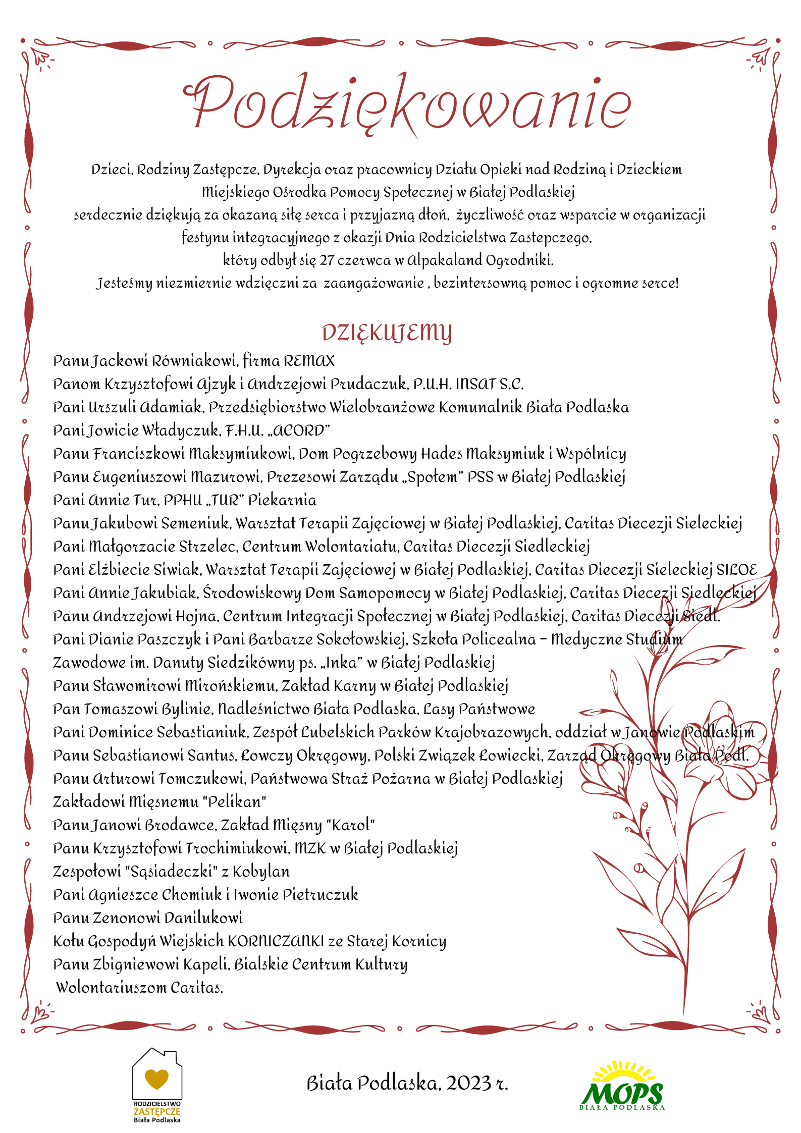 Dział Opieki nad Rodziną i Dzieckiem Miejskiego Ośrodka Pomocy Społecznej w Białej Podlaskiej składa serdeczne podziękowania Patronom oraz Darczyńcom za ogromne serce, życzliwość i okazane wsparcie, które przyczyniło się do organizacji festynu z okazji Dnia Rodzicielstwa Zastępczego w Studziance.